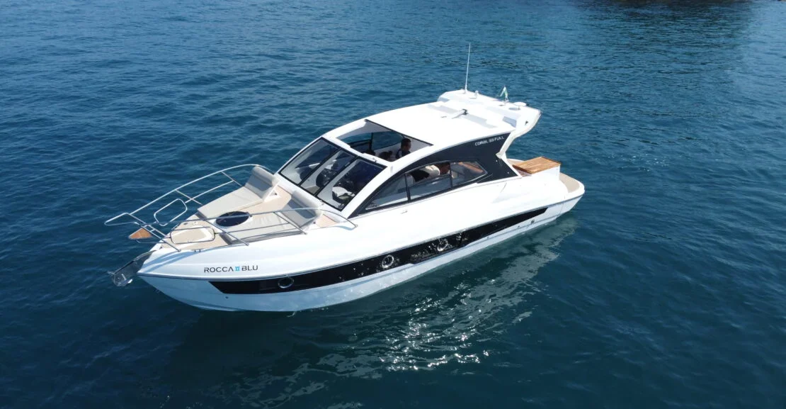 Proa fechada com cabine de proa e meia nau, motor de centro rabeta, para-brisa em vidro temperado com moldura em alumínio Targa em fibra de vidro, opção de plataforma submergível com 3 opções de para-brisa e cobertura: Soft Top (para-brisa alto e toldo), Hard Top (para-brisa alto e teto com abertura elétrica e grandes janelas laterais) e Targa (para-brisa baixo e toldo), o barco já permite pernoites confortáveis e maior tempo de estada em água, se tornando o menor cruiser da linha Coral.