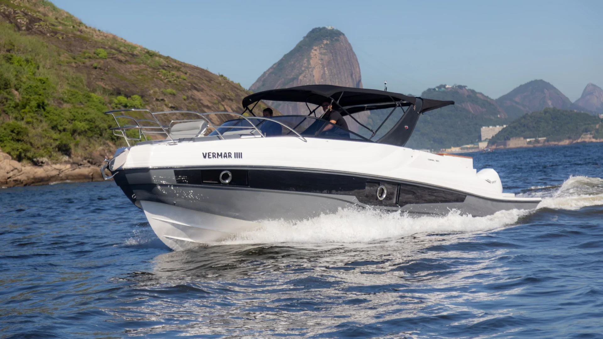 Proa aberta, motor de centro rabetapermite passeios Day Cruiser, convés com banheiro e cabine, para-brisa em vidro temperado com moldura em alumínio Targa em fibra de vidro, opção de plataforma submergível.