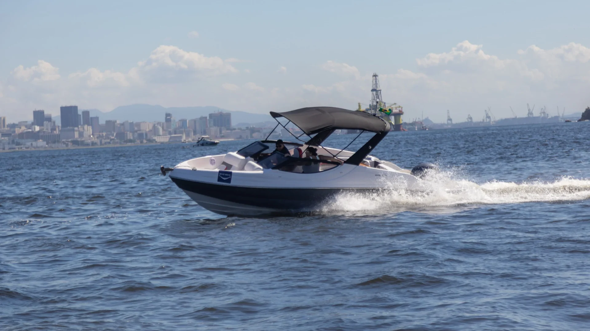 Proa aberta com motor de popa, para-brisa em vidro temperado com moldura em alumínio, opção de convés com banheiro e cabine, opção de targa em fibra de vidro.