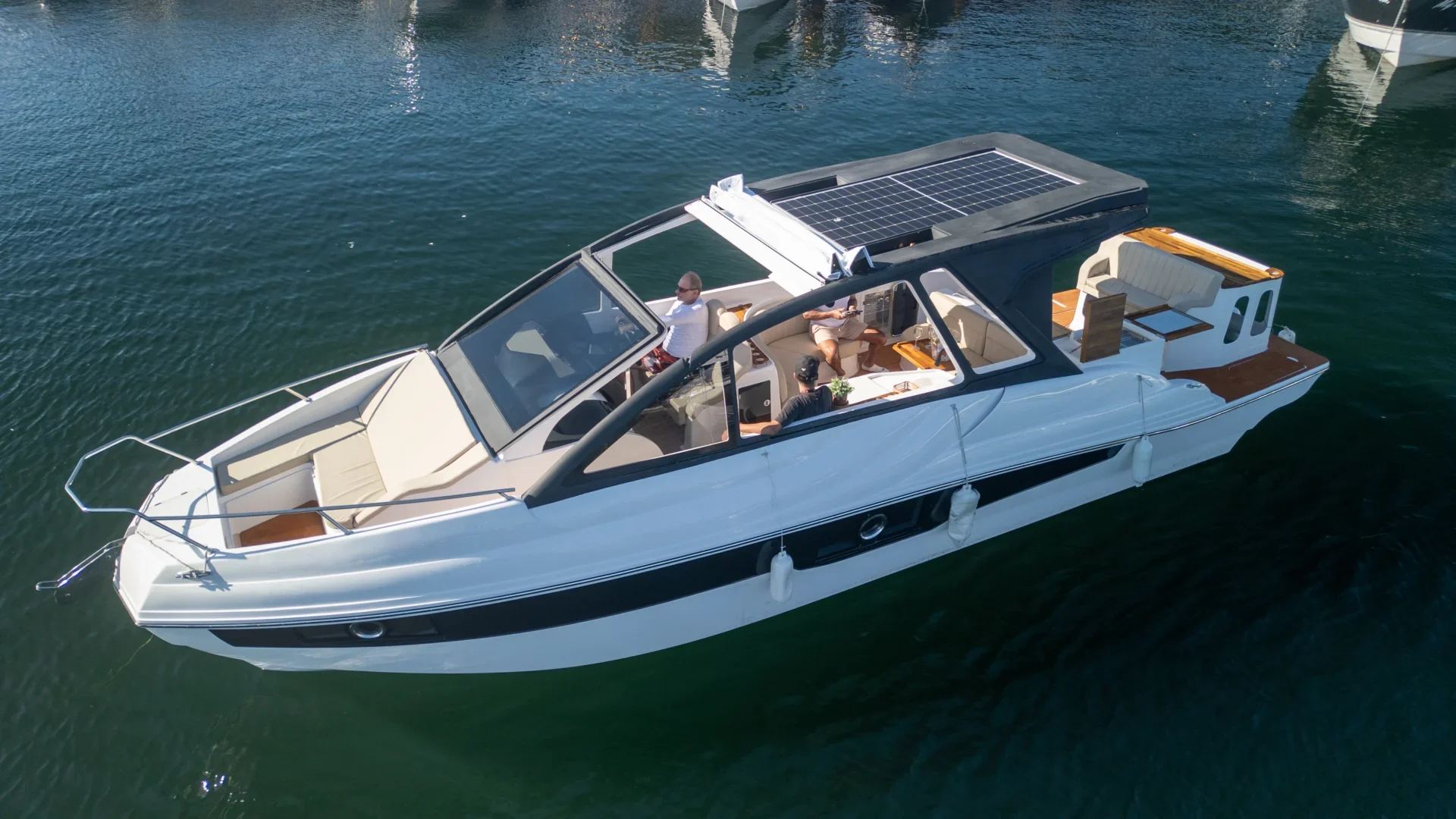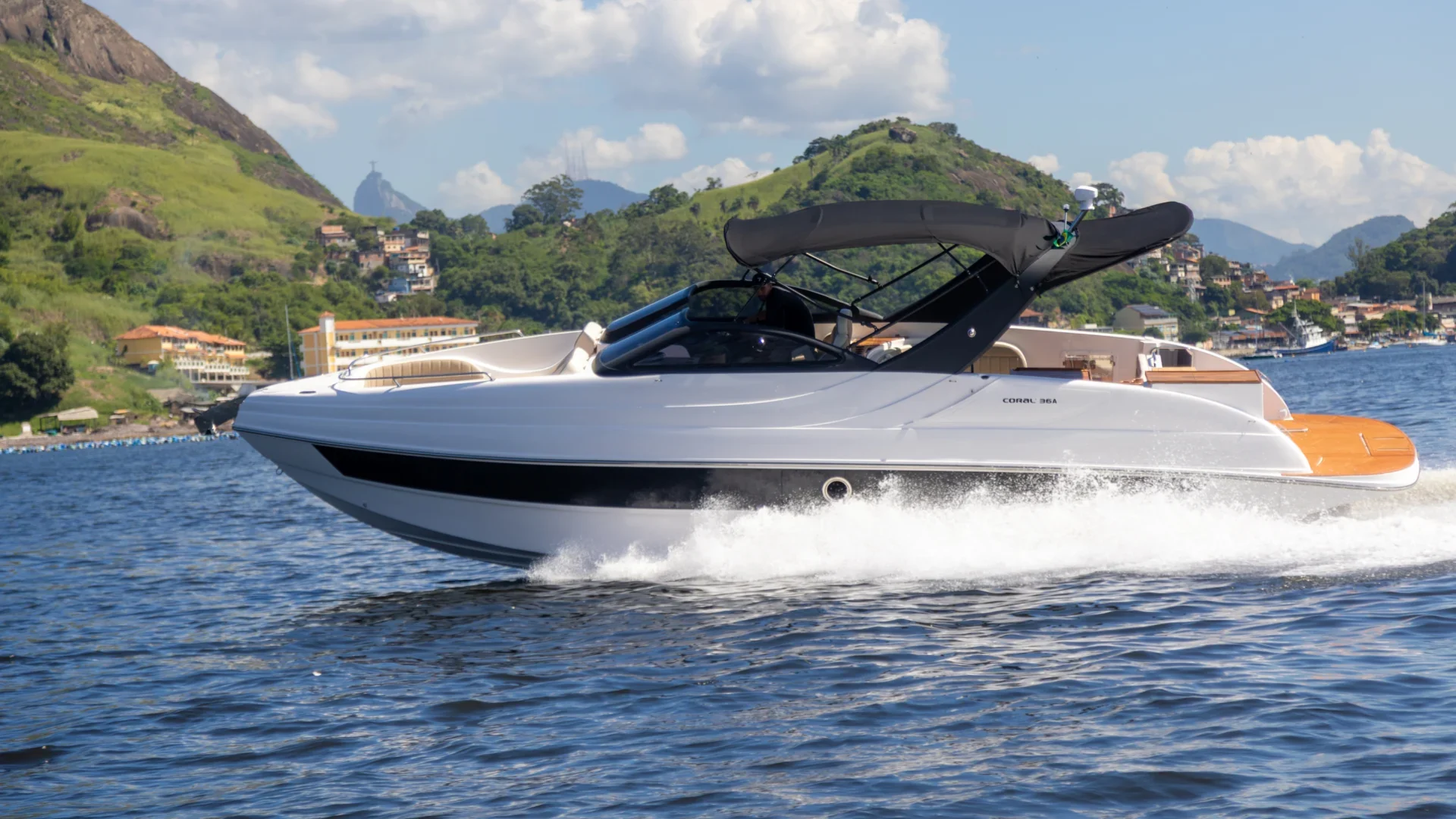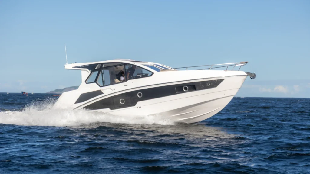Proa fechada com cabine de proa e meia nau, motor de centro rabeta, para-brisa em vidro temperado com moldura em alumínio Targa em fibra de vidro, opção de plataforma submergível, com 3 opções de para-brisa e cobertura: Soft Top (para-brisa alto e toldo), Hard Top (para-brisa alto e teto com abertura elétrica e grandes janelas laterais) e Targa (para-brisa baixo e toldo).