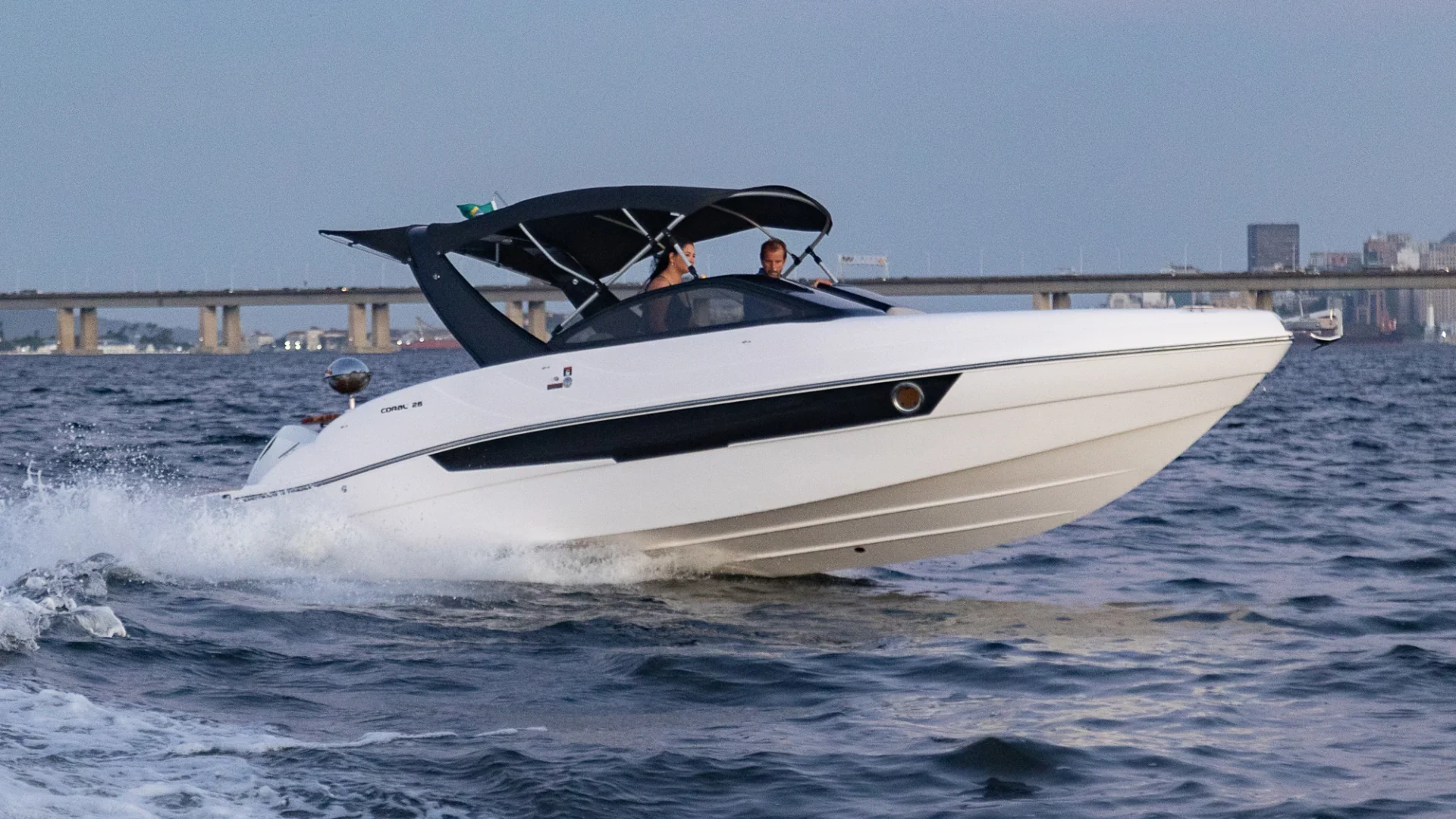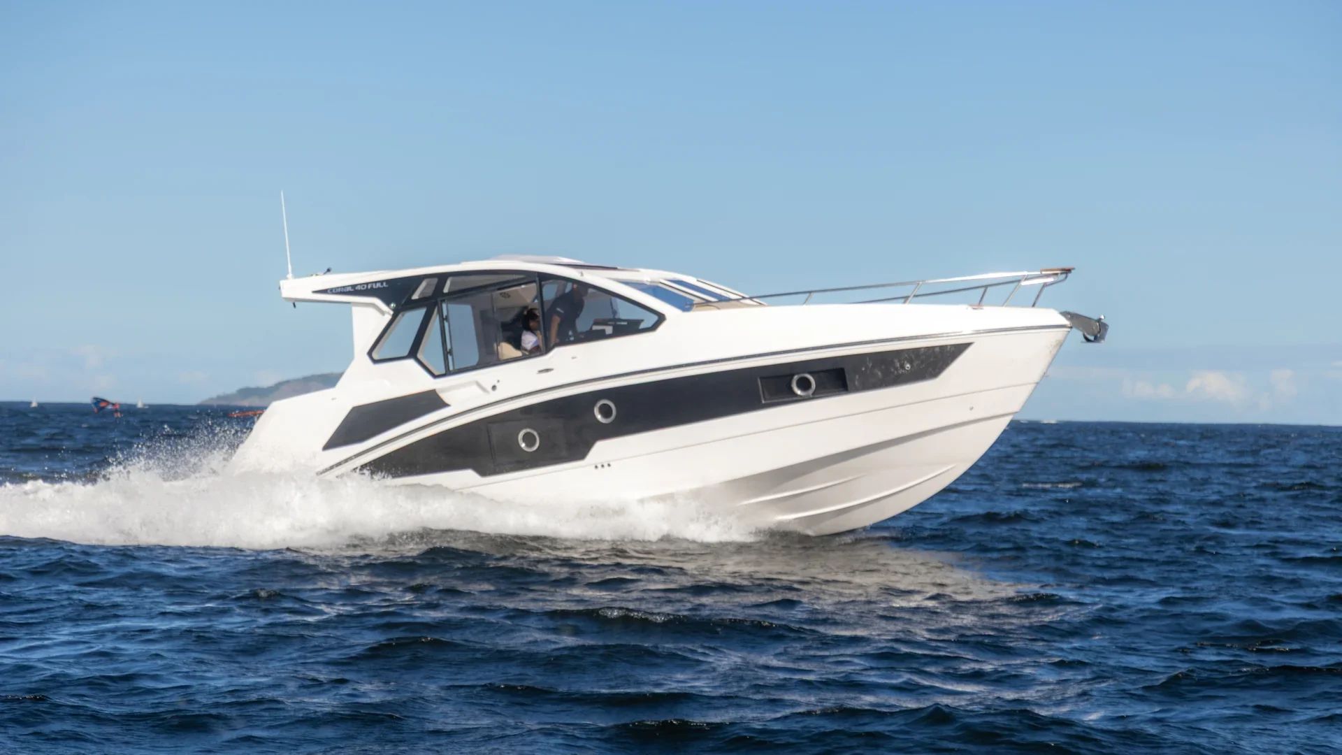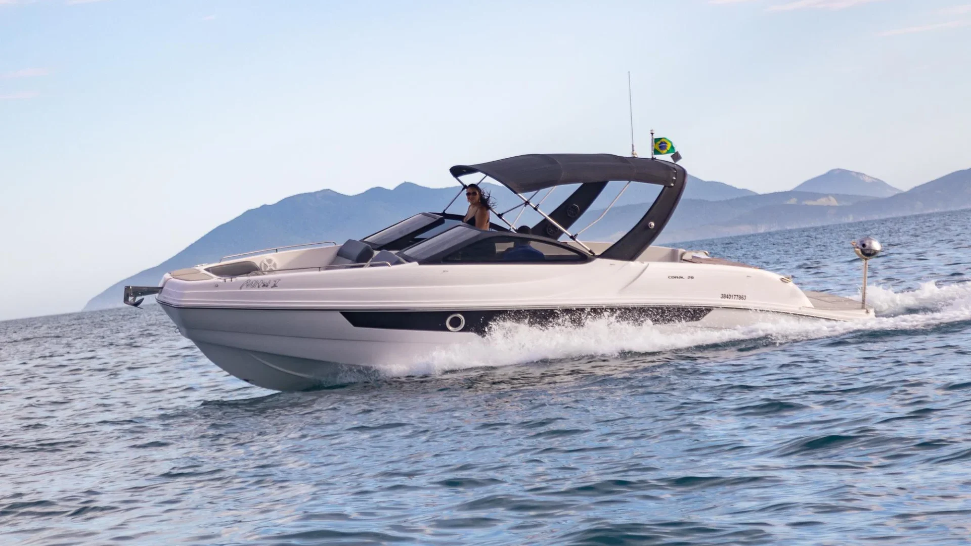 Proa fechada com cabine de proa e meia nau, motor de centro rabeta, para-brisa em vidro temperado com moldura em alumínio Targa em fibra de vidro, opção de plataforma submergível, casco geração 4 Coral: Parte inferior com V profundo para cortar melhor as ondas. Parte superior com maior boca para melhor aproveitamento interno.
