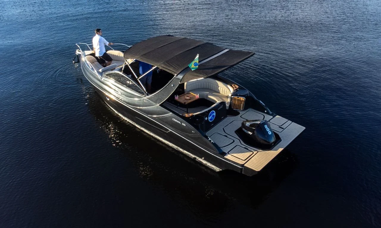 Proa aberta, motor de centro rabeta, convés com banheiro e cabine para-brisa em vidro temperado com moldura em alumínio Targa em fibra de vidro, opção de plataforma submergível.