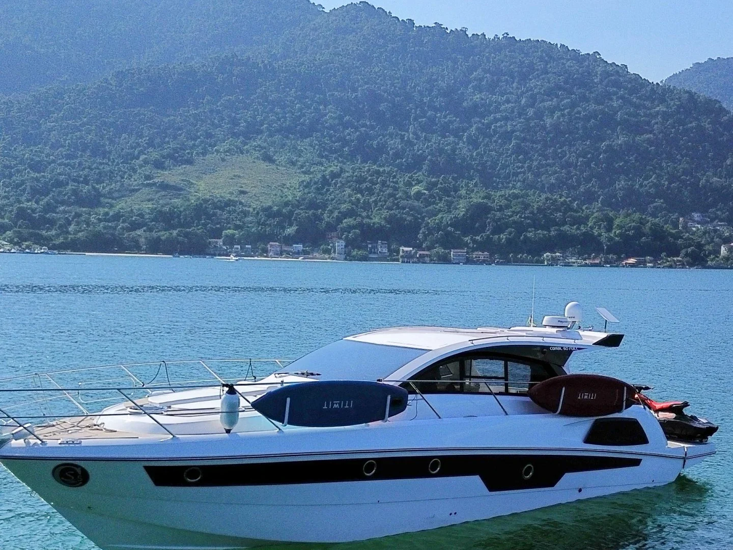 Proa fechada com 3 cabines, motor de centro rabetaou IPS, para-brisa em vidro temperado com moldura fibra de vidro HT com grandes janelas laterais, opção de plataforma submergível, opção de Fly, opção de porta de fechamento no salão.